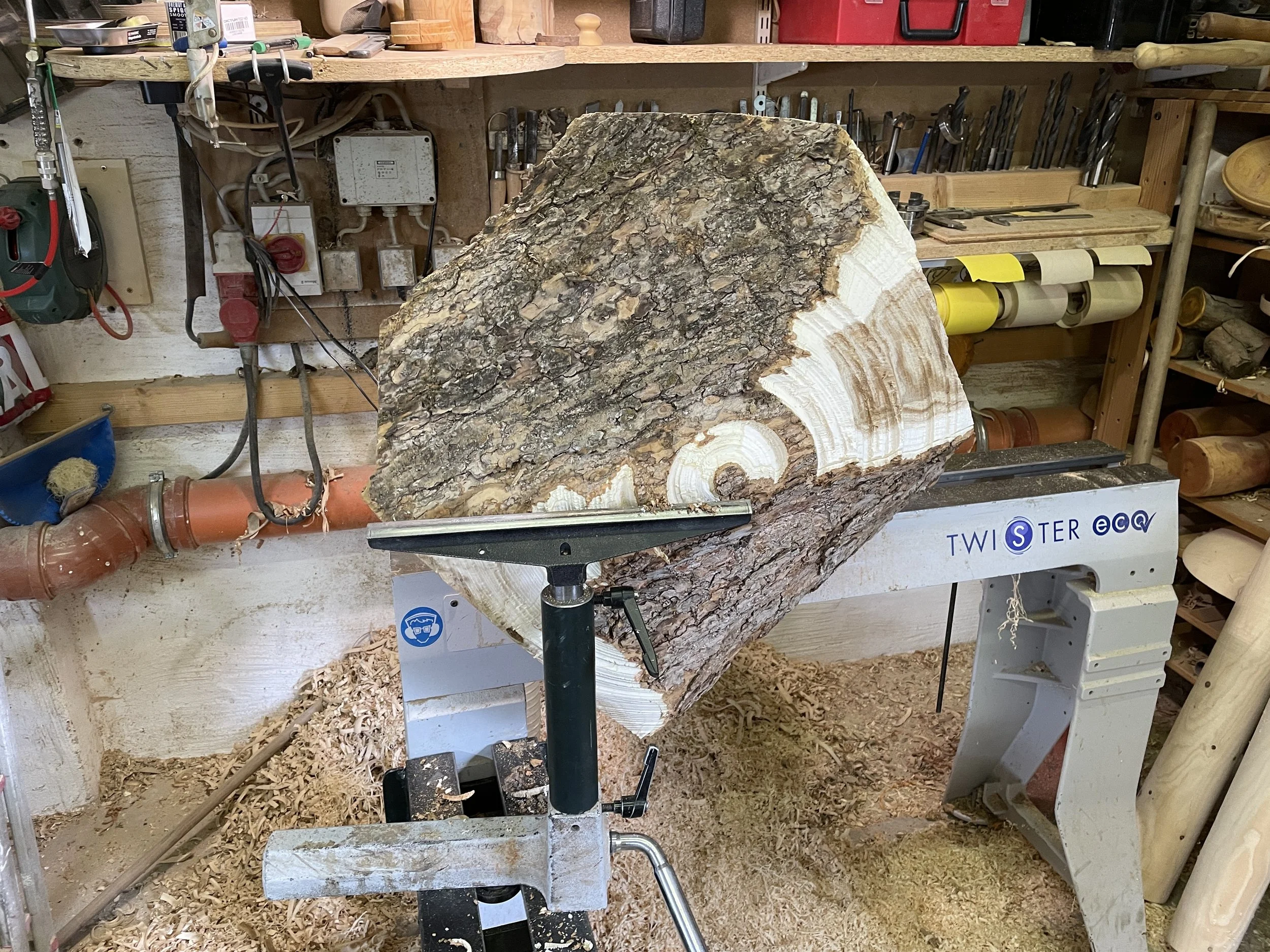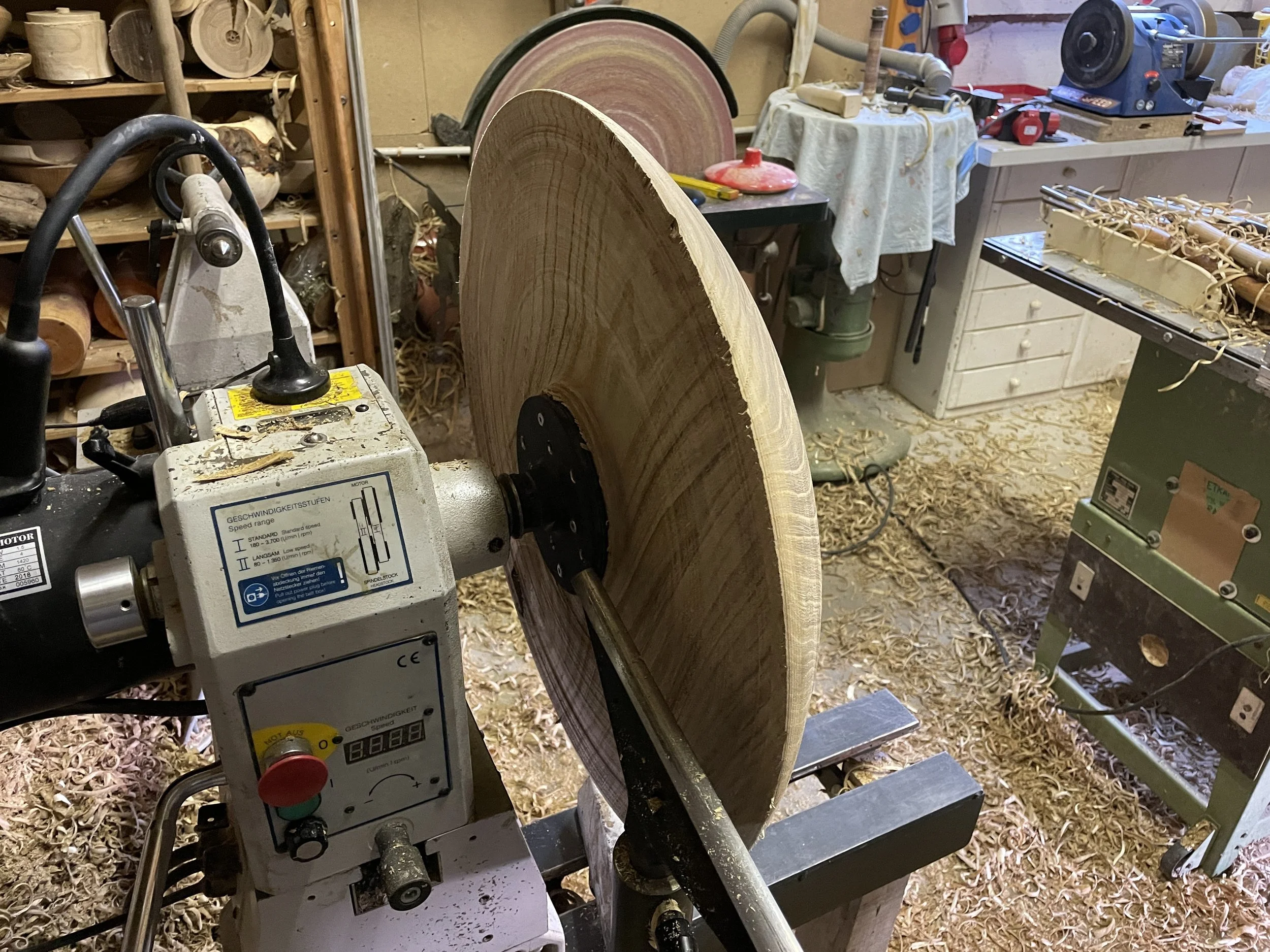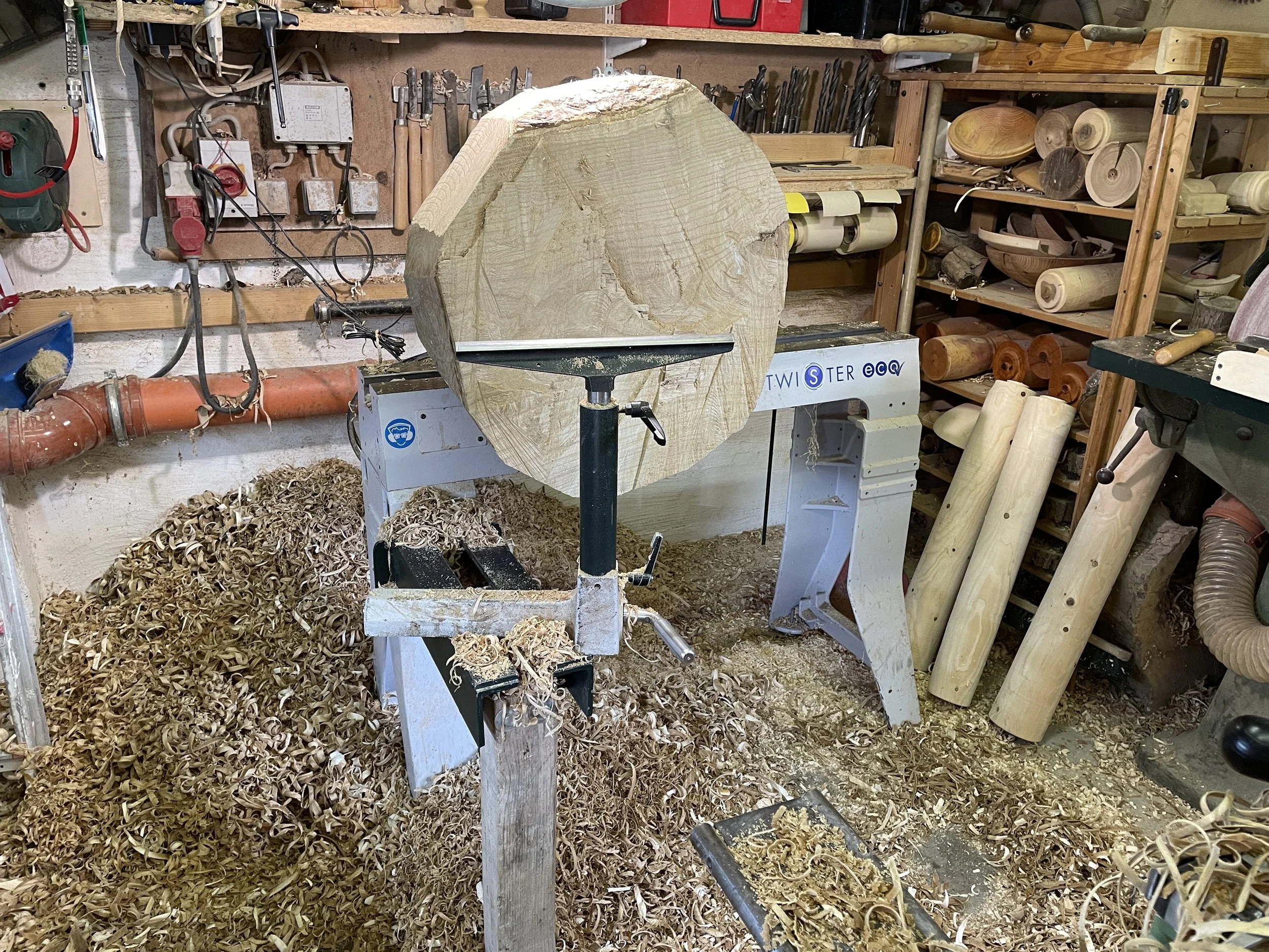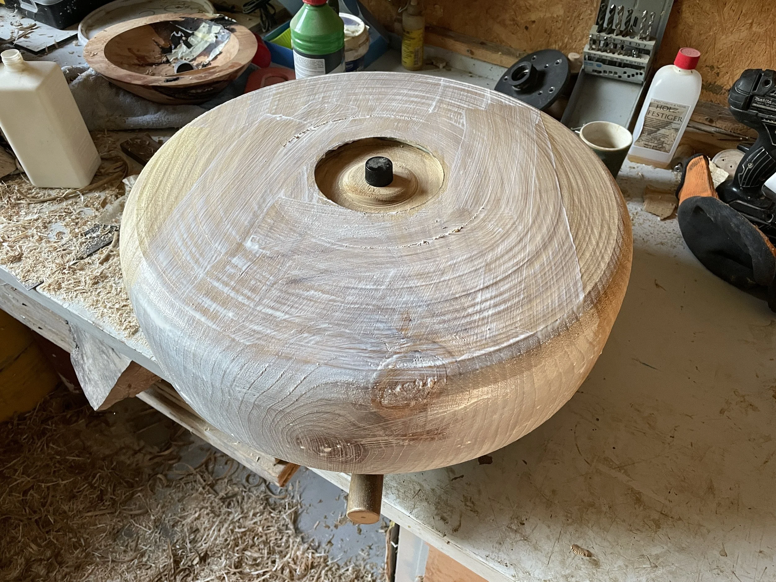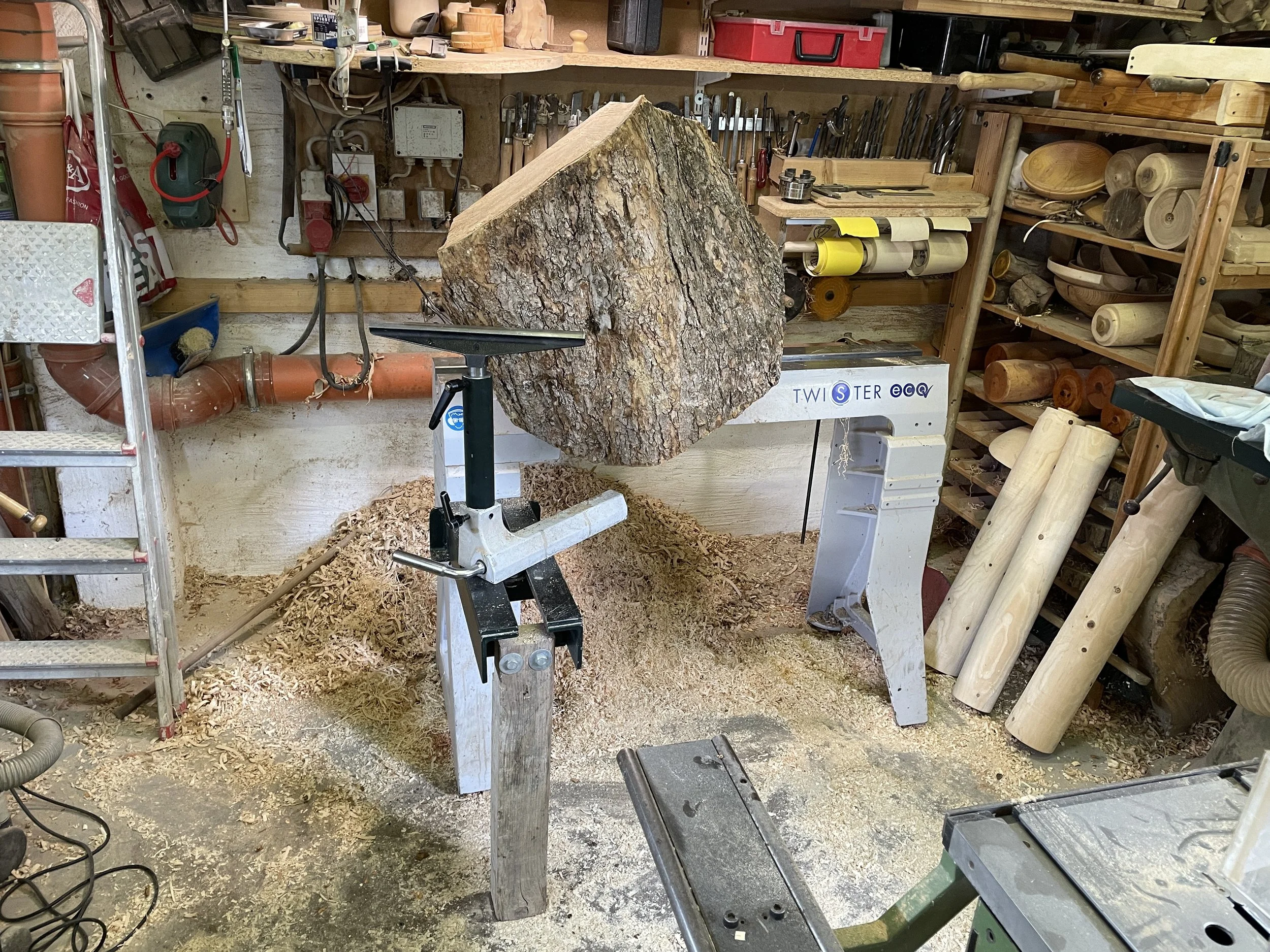 Erst wird er vom Pilz, einem Hallimasch, befallen und dann von mir noch mit verschiedenen Sägen und Drechselmessern malträtiert.