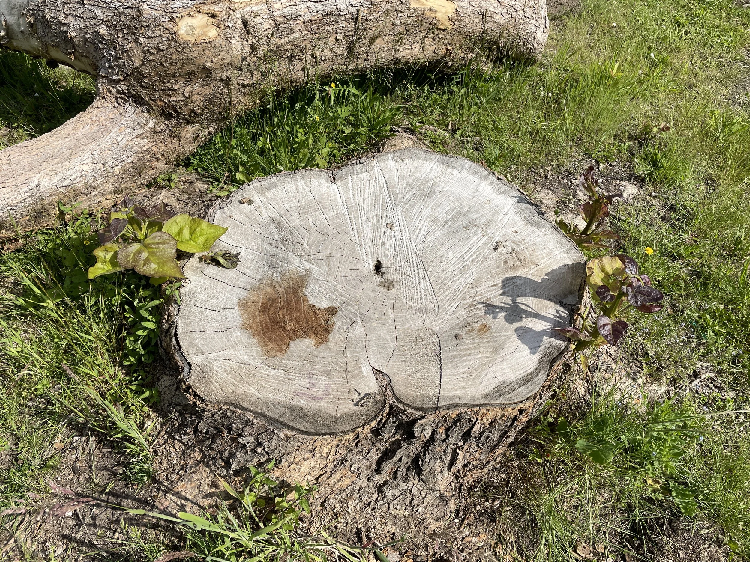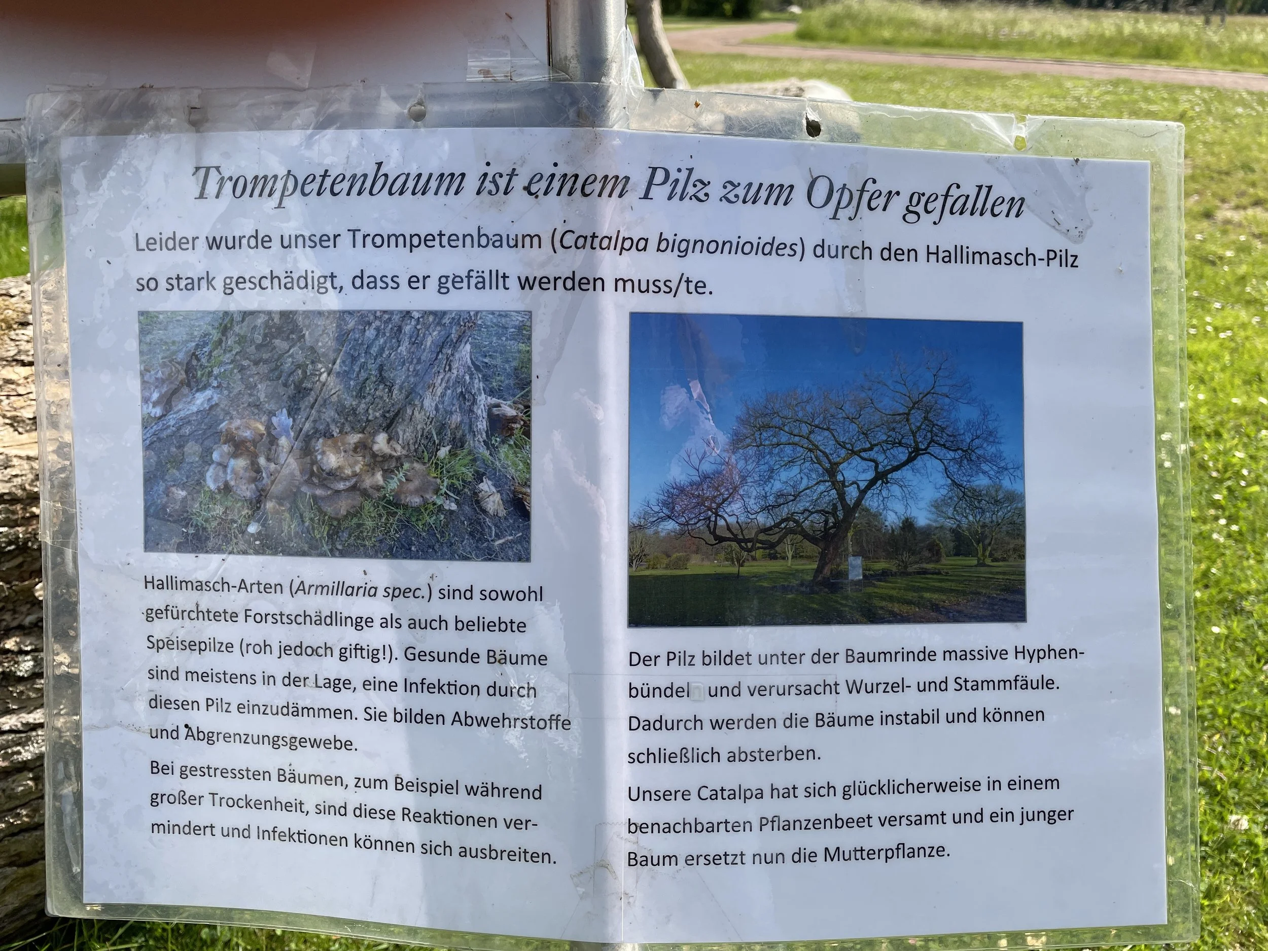 Dieser Baum, ein Trompetenbaum ( Catalpa bignonioides ), der im botanischen Garten der Uni-Düsseldorf stand, hat schreckliches mitgemacht.